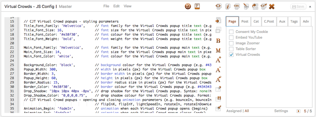 - Create a new code block and title it Virtual Crowds – JS Config. Copy the entire code contents of the file virtual-crowds-js-config.txt and paste it into the code block editor. Change the location hook from Header to Footer by clicking the ‘H‘ icon, which should change to ‘F‘. Select the Assignment checkbox (e.g. Page, Post, etc) where you will add the CJT Virtual Crowd notices popup and then click Save