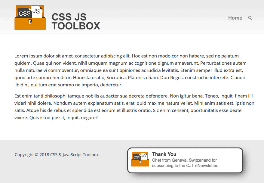 The CJT team has made this fully customisable. Meaning, you can customise things like the message, the popup position and duration, the font colour and size, the animation effect, the background colour, whether to include borders or drop shadows.