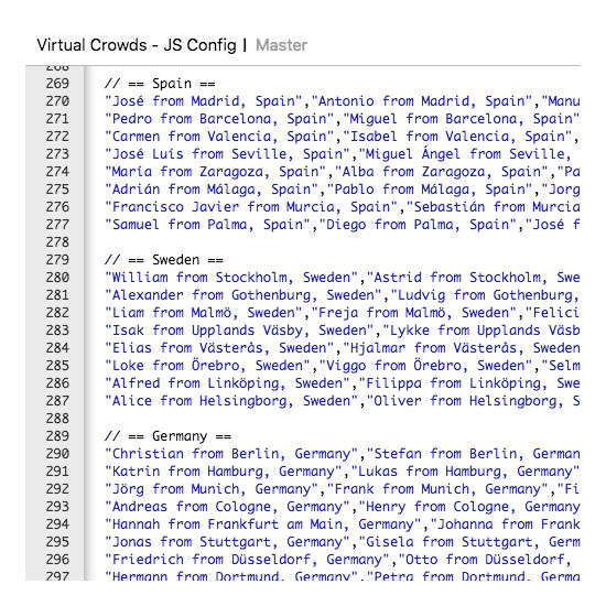 But the power of CJT Virtual Crowd lies in the user data. We have created almost 1400 users that simulate real website users. Each user has a first name, a city, and a country. It was a painstaking process that has taken weeks of research and data building, which was based on selecting: